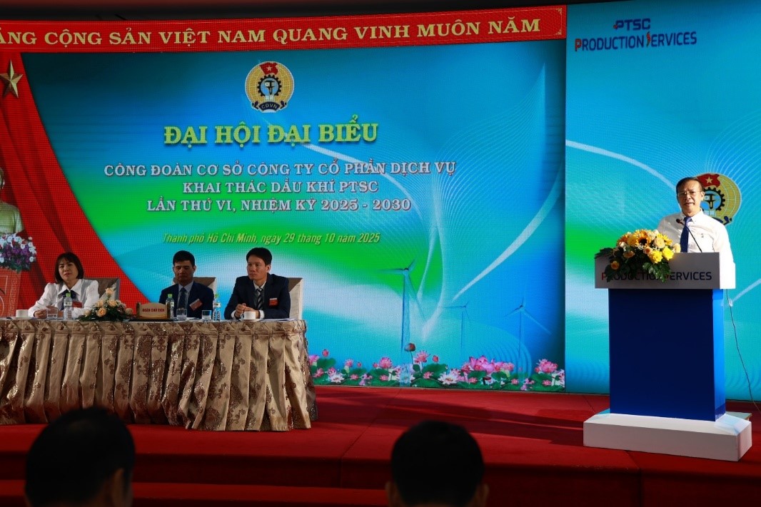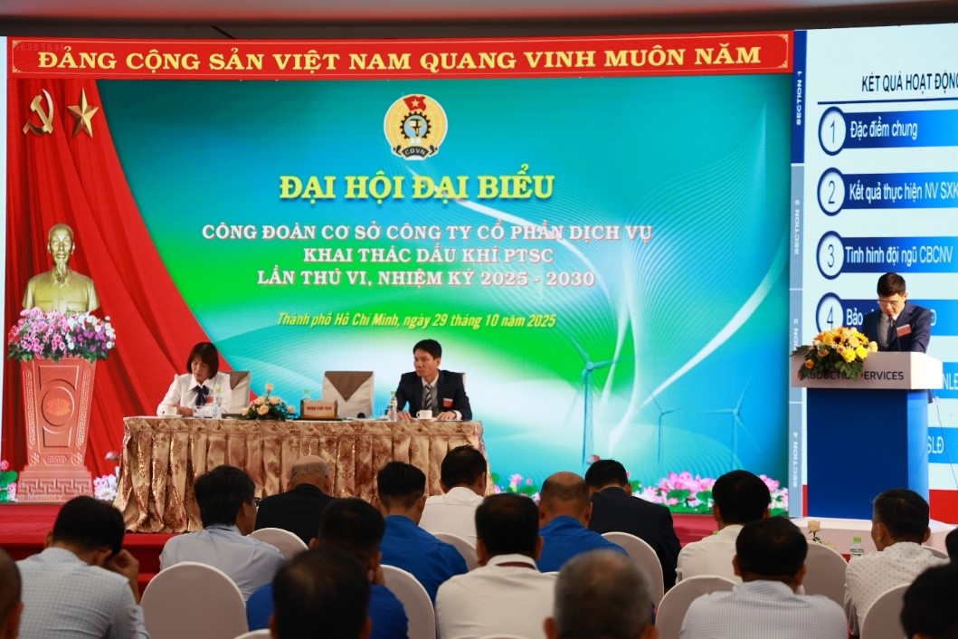 Chiều ngày 29/10/2025, Công đoàn Cơ sở Công ty CP Dịch vụ Khai thác Dầu khí PTSC đã tổ chức thành công Đại hội Đại biểu lần thứ VI, nhiệm kỳ 2025-2030 tại Khách sạn Dầu khí, phường Vũng Tàu, TP. Hồ Chí Minh. Đến tham dự và chỉ đạo Đại hội có đồng chí Vũ Đức Cường – Ủy viên BCH Công đoàn Tập đoàn, Phó Chủ tịch Thường trực Công đoàn Tổng công ty PTSC; đồng chí Nguyễn Quốc Hoàng – Bí thư Đảng ủy, Giám đốc Công ty; cùng 100 đại biểu chính thức đại diện cho 570 người lao động trong toàn Công ty.