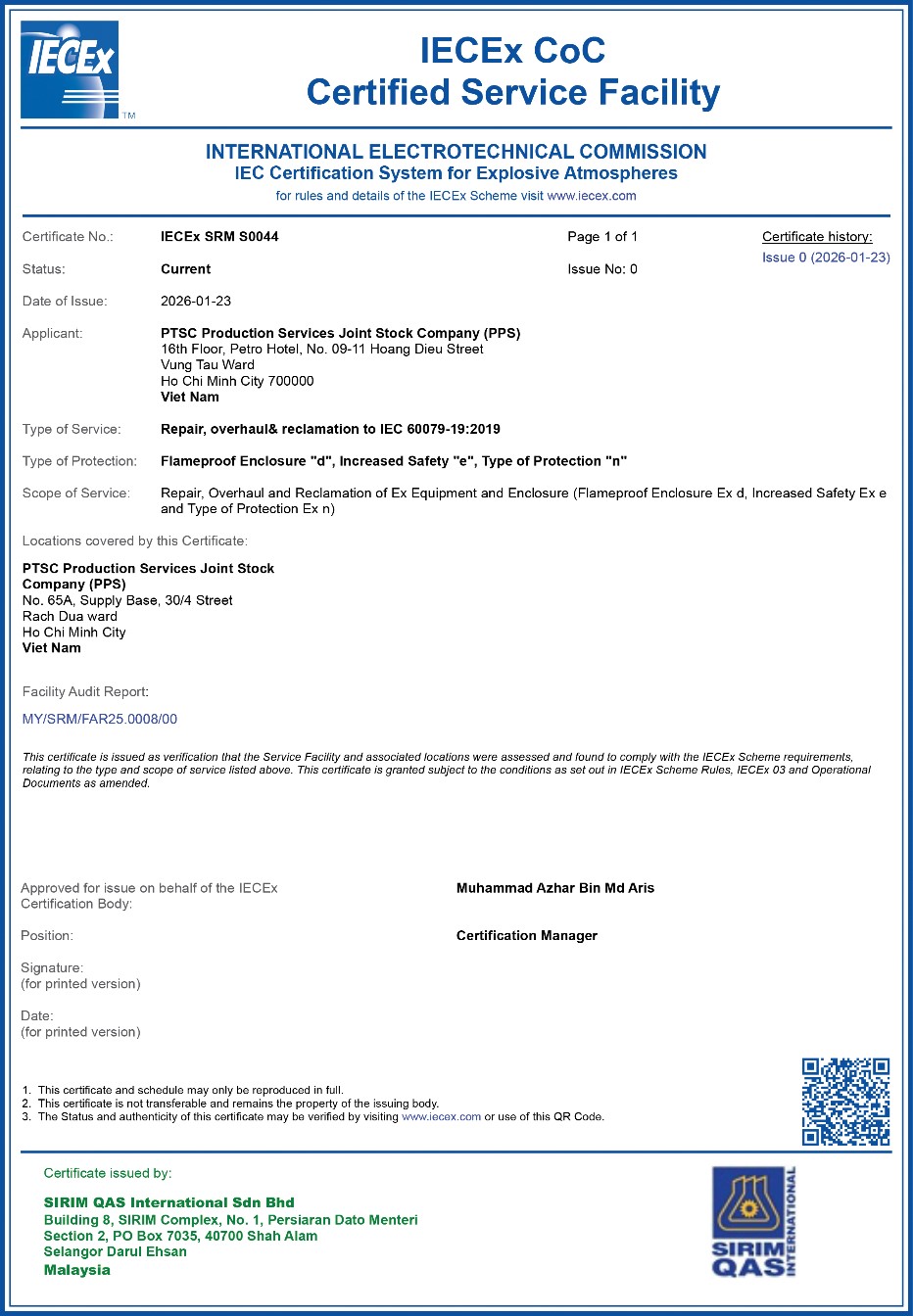 Công ty Cổ phần Dịch vụ Sản xuất PTSC (PPS) vừa chính thức hoàn thành công tác đánh giá và được cấp chứng nhận IECEx CoC – Certified Service Facility của Ủy ban Kỹ thuật Điện Quốc tế (IEC) cho hoạt động sửa chữa, bảo dưỡng thiết bị điện phòng nổ, với mã chứng chỉ: IECEx SRM S0044. Đây là một cột mốc quan trọng, khẳng định năng lực kỹ thuật, hệ thống quản lý chất lượng và định hướng phát triển dịch vụ theo tiêu chuẩn quốc tế của Công ty.