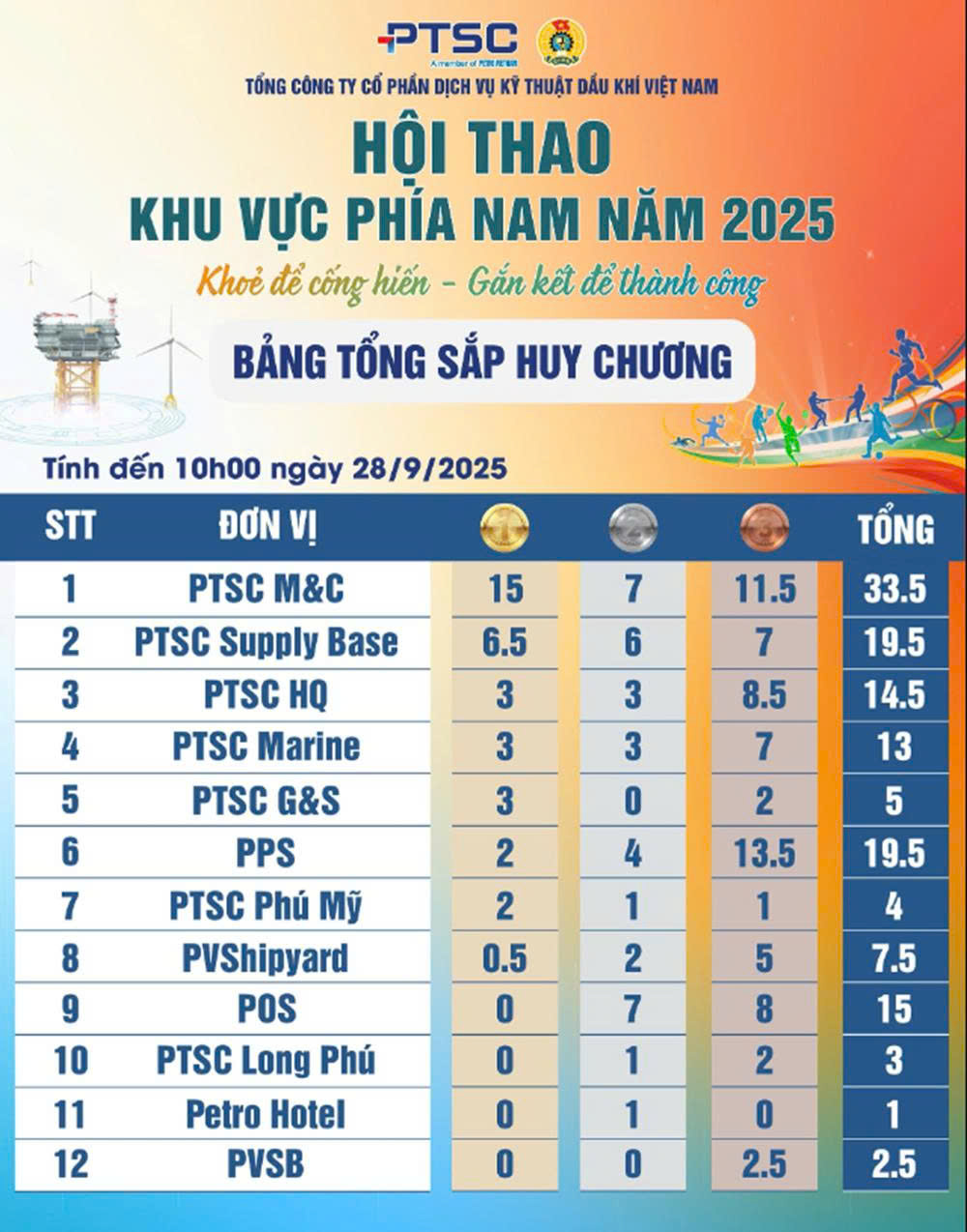Hội thao PTSC Khu vực miền Nam năm 2025 đã diễn ra sôi nổi trong ba ngày 26, 27 và 28/9/2025 tại Trung tâm Văn hóa Thể thao Vietsovpetro, với sự tham gia của hơn 700 vận động viên đến từ 12 đơn vị thành viên, trực thuộc Tổng công ty. Đây là sự kiện ý nghĩa chào mừng thành công Đại hội Đảng bộ Tổng công ty lần thứ VIII và Đại hội Đảng bộ Tập đoàn Công nghiệp – Năng lượng Quốc gia Việt Nam lần thứ IV, đồng thời tạo động lực tinh thần to lớn, khích lệ người lao động hăng hái thi đua, phấn đấu hoàn thành vượt mức kế hoạch sản xuất kinh doanh năm 2025.